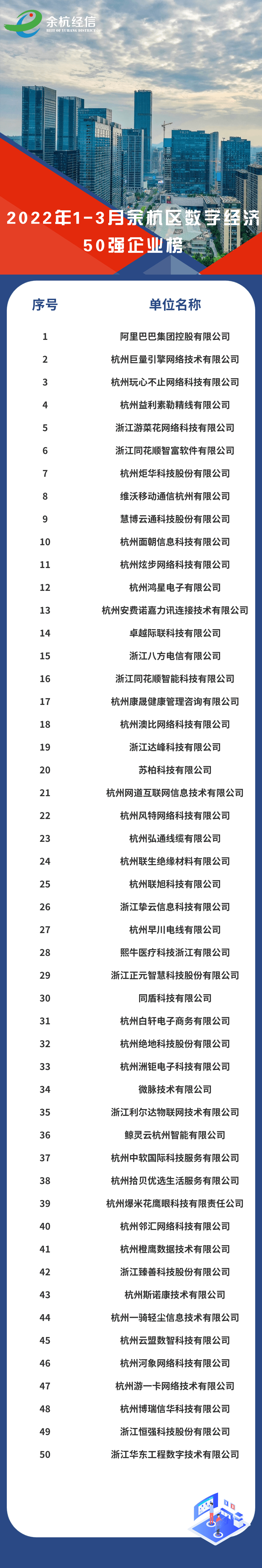 2022年5月9日,余杭区经济和信息化局公布了“2022年1-3月余杭区数字经济50强企业榜”,凯发官网k8凭借技术创新、商业模式、企业管理、品牌影响力等方面的综合表现,喜获2022年1-3月余杭区数字经济50强企业。