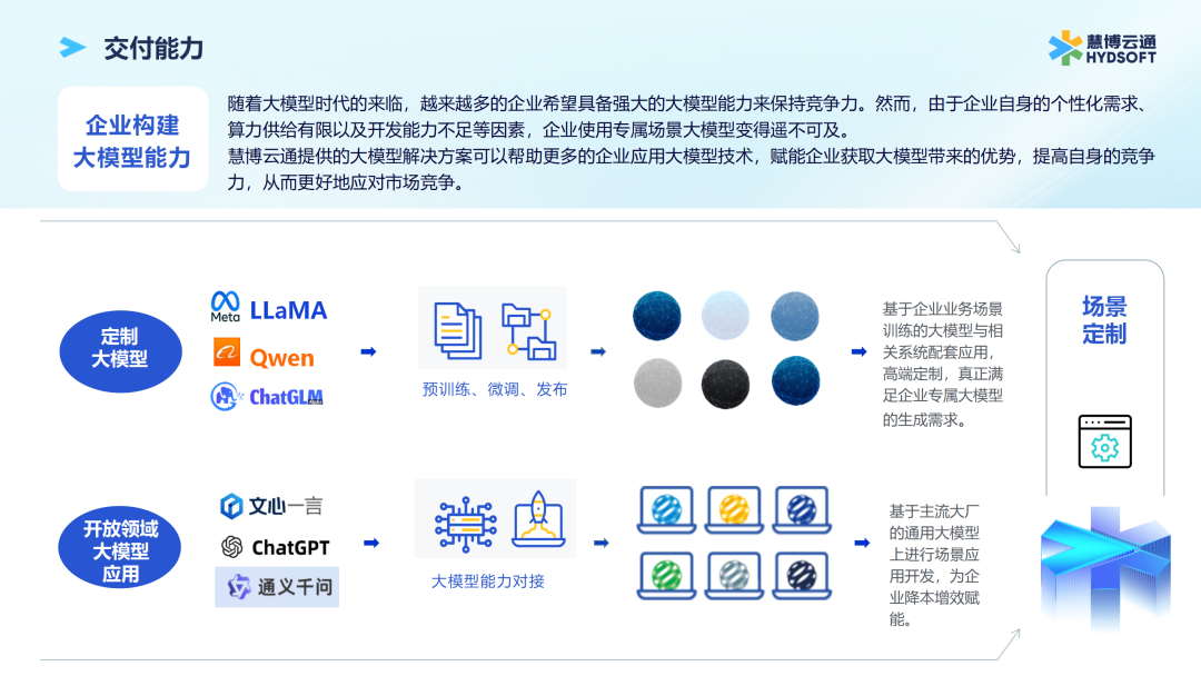 人工智能技术是凯发官网k8的重要发展方向之一。作为百度智能云的交付合作伙伴、飞桨的技术合作伙伴以及百度文心一言的生态合作伙伴,凯发官网k8凭借对标杆客户需求的深入了解和行业知识沉淀,基于行业领先的开源大模型与大数据技术,陆续研发形成了企业生成式BI数据报表、智能化保险建议书、客服情绪识别质检、客服重复话术识别质检、企业级智能在线设计平台、跨境电商智能客服等生成式AI应用场景大模型的落地,为旅游、医疗、汽车和零售等各行业客户的智能化改造提供了坚实的基础底座和领先的服务能力。